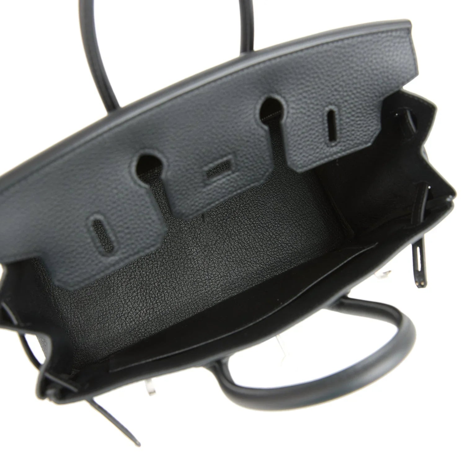 The interior is lined with Black chevre leather and has a zip pocket with an Hermès engraved zipper pull and an open pocket on the opposite side.