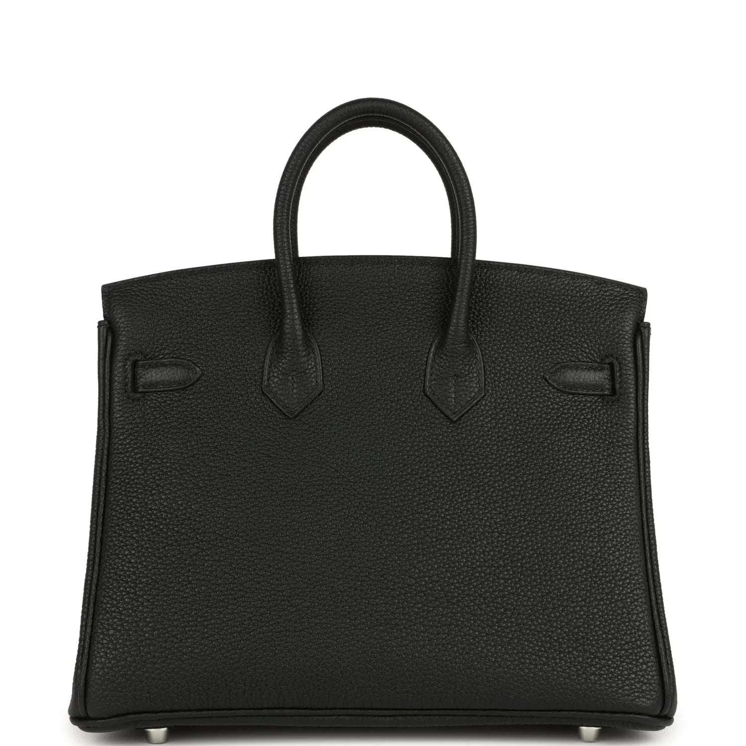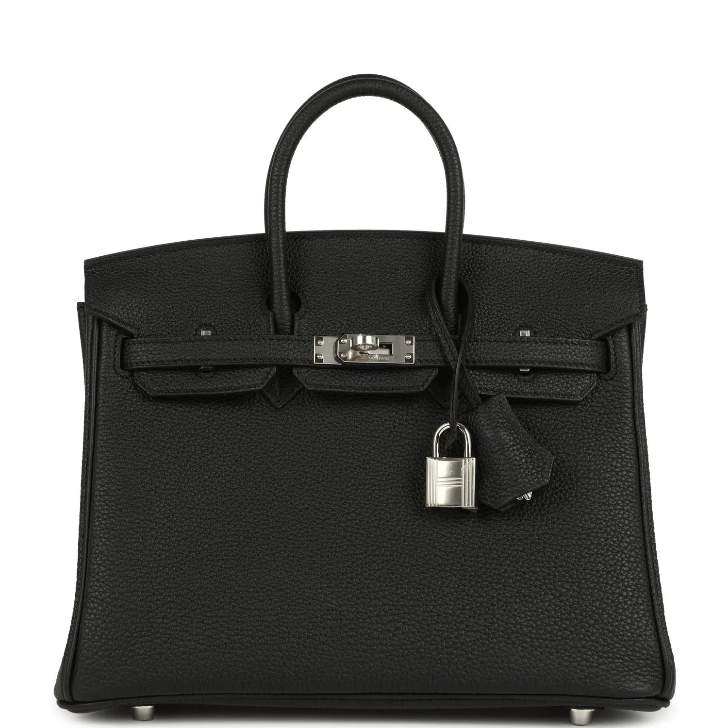 This Birkin is in Black togo leather with brushed palladium hardware, has tonal stitching, front flap, two straps with center toggle closure, clochette with lock and two keys, and double rolled handles.